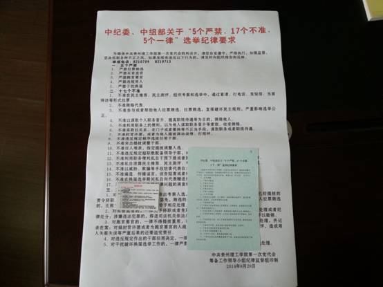 此外,在筹备期间加大了换届纪律宣传教育力度,大力营造换届纪律宣传氛围。一是通过伟德国际victor1946主页及党代会专题网站、校报等进行专题宣传报道,提高换届纪律知晓率;二是制作了换届纪律“5个严禁、17个不准、5个一律”卡片和张贴宣传公告,卡片发放到每位党员,各基层党组织分别在单位显著位置张贴宣传公告;三是通过学校教职工QQ群、学校理工人微信平台、学校处级干部微信平台等发布换届纪律,加深对换届纪律的认知度。做到了广播有声、网络有影、报纸有字,营造了换届选举纪律氛围。