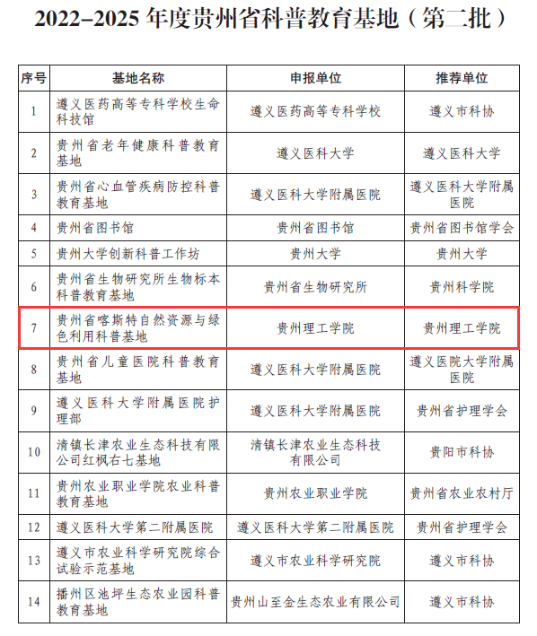日前,在贵州省科学技术协会主办的贵州省科普教育基地联盟成立大会上对获得2022—2025年度贵州省科普教育基地的42家单位进行了授牌,伟德国际victor1946组织申报的“贵州省喀斯特自然资源与绿色利用科普基地”名列其中。该科普基地由学校科技处指导,资源与环境工程学院牵头,联合矿业工程学院、材料与能源工程学院(贵州省轻金属材料制备技术重点实验室)、化学工程学院、航空航天工程学院、创新创业中心等多部门联合申报。