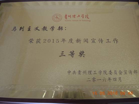 本网讯(蓝文思 张建军)2016年6月2日,校党委宣传部下发《关于表彰2015年度新闻宣传工作先进集体、先进个人的通知》(贵理工党宣通〔2016〕9 号),对2015年度新闻宣传工作先进集体、先进个人进行了表彰。马列主义教学部在全体教职工的共同努力下,通过一年的辛勤工作和积极进取,荣获2015年度新闻宣传工作三等奖。此次共有7个先进集体和若干先进个人获此殊荣。