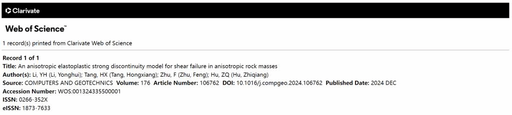 日前,伟德国际victor1946土木工程学院李永辉老师以第一作者身份在国际权威期刊《COMPUTERS AND GEOTECHNICS》(TOP期刊,中科院一区,影响因子IF=5.3)上发表题为《An anisotropic elastoplastic strong discontinuity model for shear failure inanisotropic rock masses》研究论文,并被Web of Science数据库检索。
