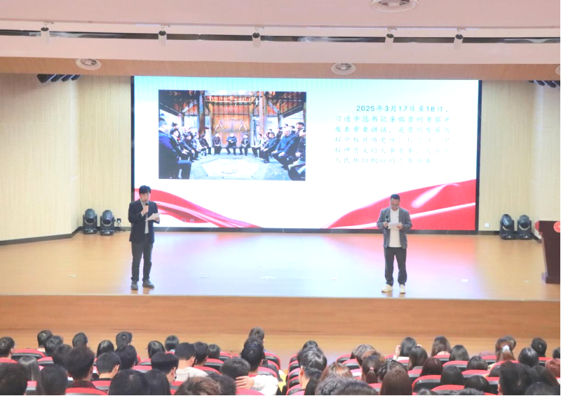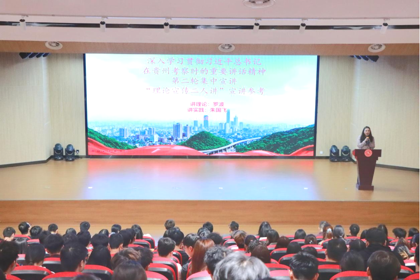 罗波和朱国飞介绍了习近平总书记在贵州考察的基本情况,向师生解读习近平总书记考察贵州时的重要讲话精神的突出特点,并围绕讲话中七个方面的主要内容展开宣讲,让在场所有人深刻感受到党中央对贵州发展的深切关怀与殷切期望。